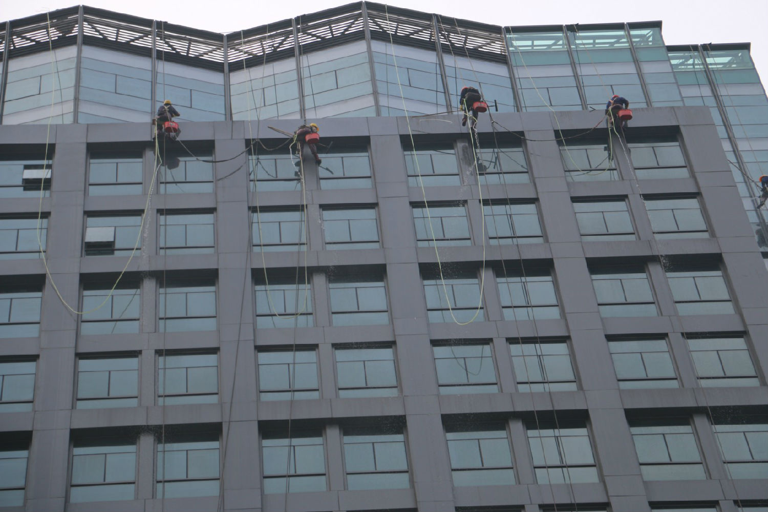 6、高空人員自行調整工作繩,使其拉緊,確認自己座穩后,開始清潔工作。注意事項:應注意將繩子避開棱角處,或銳利處,防止損傷繩子,有高壓線的地方不可下繩。天氣狀況:在風力大于5級以上,雷雨天氣不能下繩。